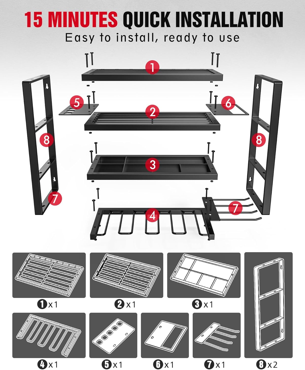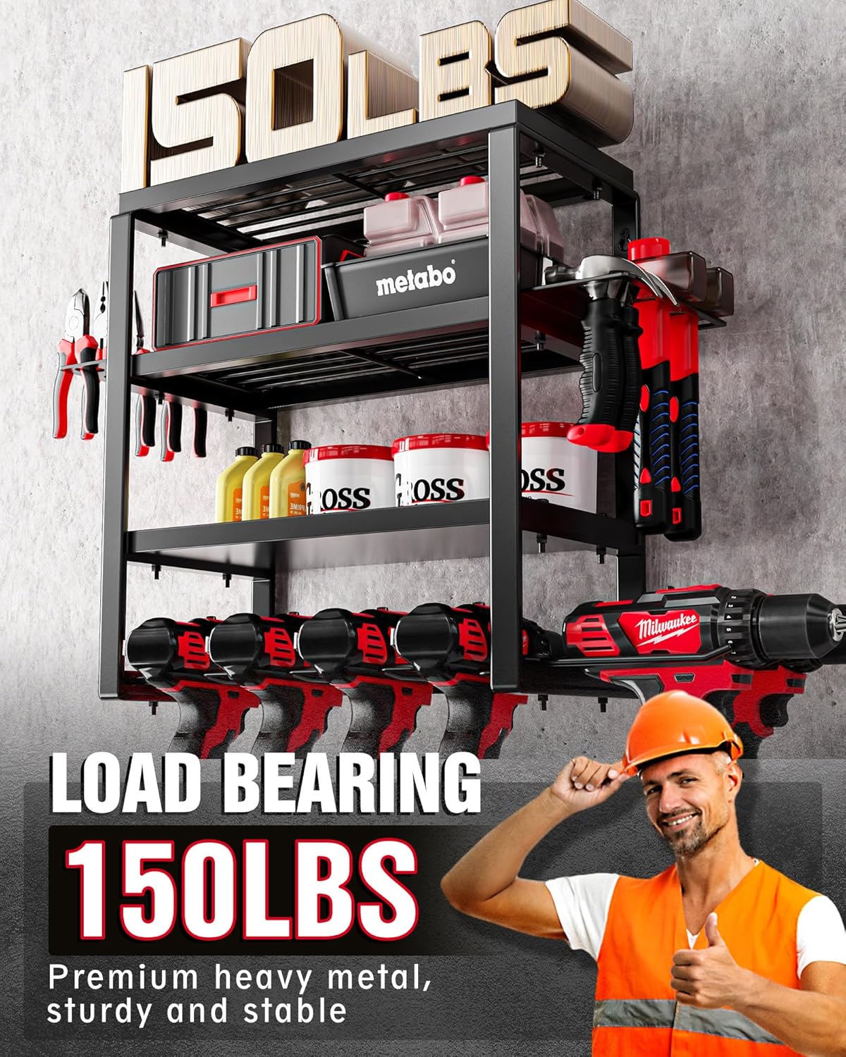 • LOAD BEARING 150 LBS: Our tool organizer is made of premium heavy metal, featuring durability, pressure resistance. It comes with 8 wall anchors to make the rack more sturdy and stable. After extensive load testing, each layer can support up to 37 LBS