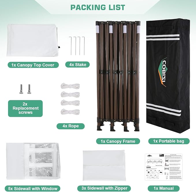 • 【Included Accessories, Warranty Service】 1x Commercial Grade 10x30 Pop Up Tent Frame, 1x Top Cover, 6x PU Coated Panels (4 x Sidewalls with Windows and 2x Sidewalls with Zippers), 8 x Ground Pegs, 4x Windproof Ropes, 1x Carrying Bags, 1x Manual. We provide 1 year warranty service. If you have any problems and questions, please feel free to contact us, we will give you the best help. Choosing us means choosing a comfortable life.