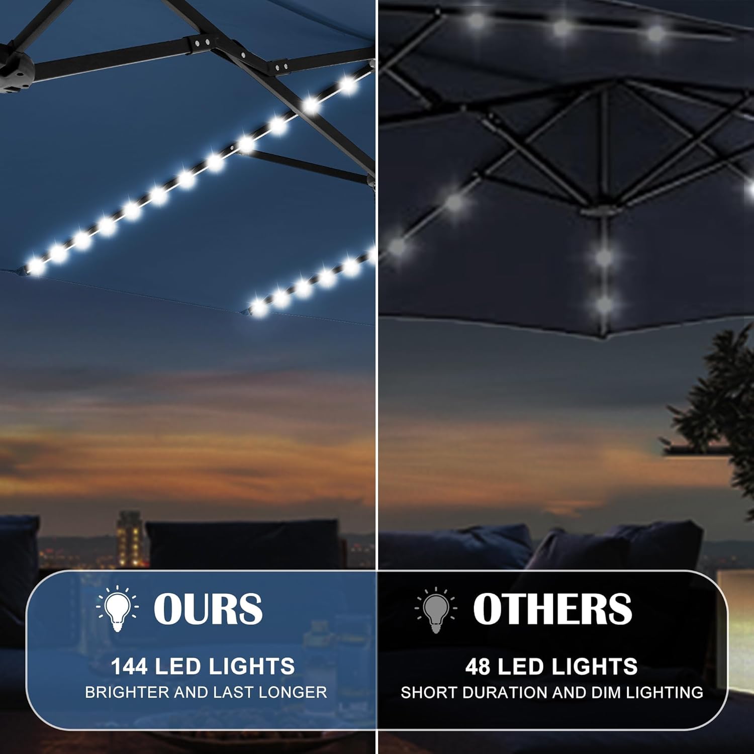 • 144 Brighter LED Bulbs: Our upgraded outdoor umbrella features enhanced solar panels, threefold LED count compared to conventional market offerings, and expanded battery capacity. This innovation delivers significantly boosted luminosity, 50% wider illumination coverage, and extended runtime—achieving 7 hours of nighttime operation per full charge, up from 4 hours