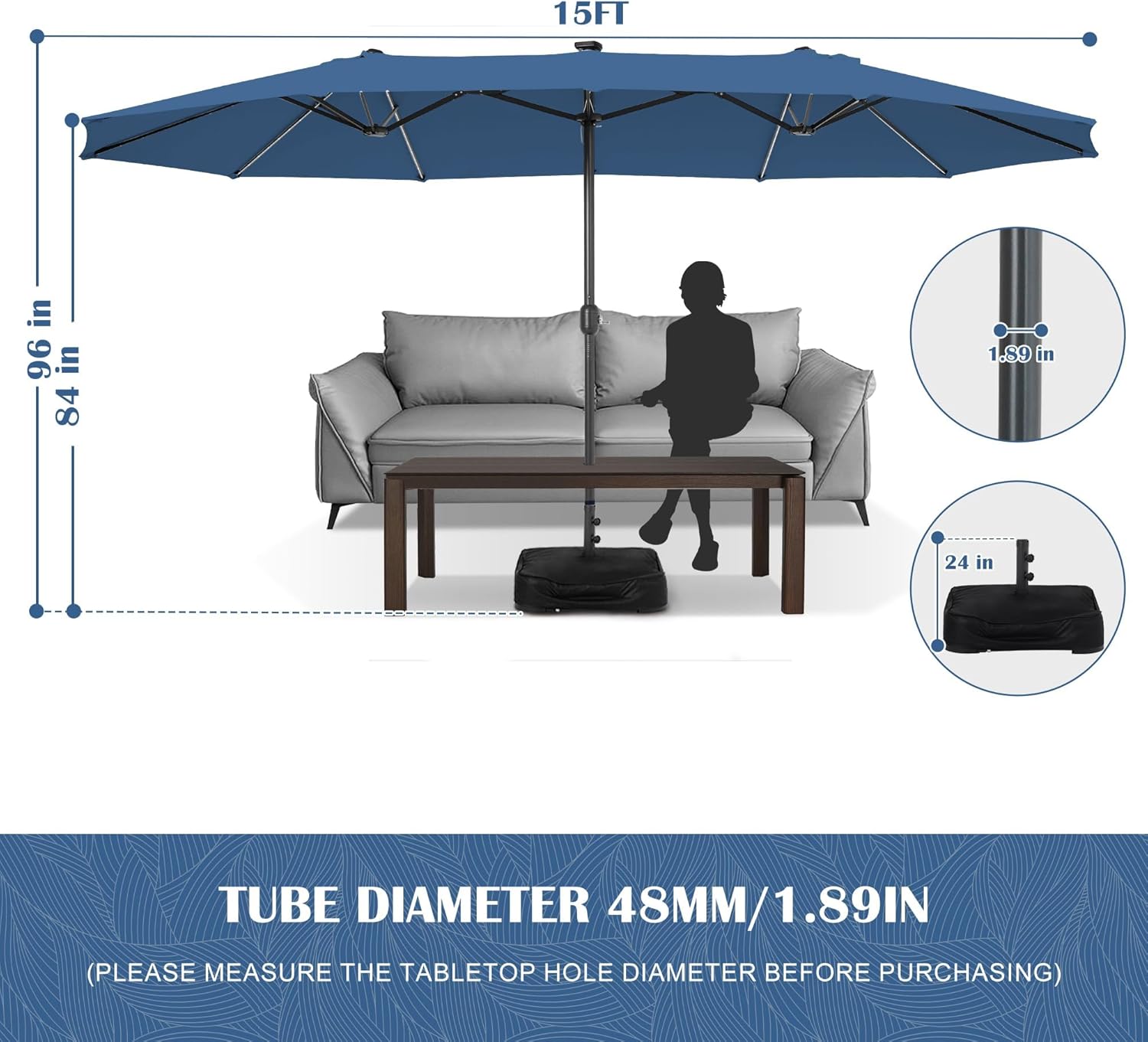 Sundale Outdoor Solar 144 LED 15 ft Patio Umbrella with Sandbag Base Included and Cover, Outdoor Double-Sided Umbrella, Navy