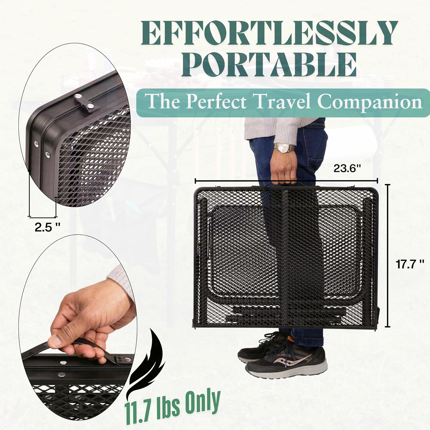 • ✅ Extra Storage Features: A Protective Cover Carry Bag, 2 wing panels, a Unique paper towel holder, a garbage holder, a mesh net with side pockets and utensil hooks for ample, organised storage. Its adjustable table design efficiently clears space and reduces clutter.