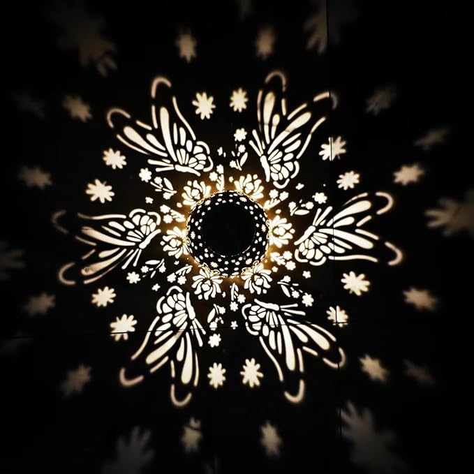 • The lantern casts a mesmerizing shadow pattern resembling an enchanting floral mandala intertwined with graceful butterfly silhouettes. Delicate blossoms and intricate wings radiate outward in perfect symmetry, creating a celestial dance of light and shadow. This luminous display transforms any space into a serene and magical ambiance, evoking a sense of wonder and artistry.