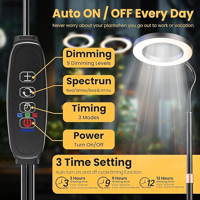 • Three cycle timing settings, this plant light will automatically turn on/off according to your desired schedule every day: 3/9/12H.