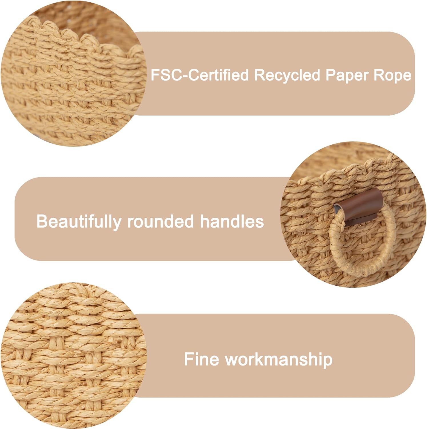 • HANDCRAFTED WITH SUSTAINABLE MATERIALS - Made with the strength of FSC-certified recycled paper rope, each delightful storage basket is enhanced with the soft elegance of vegan leather trimmings. The large basket also features beautifully designed circular handles on both sides. This perfect combination of style and functionality not only brightens your living space but also reflects our commitment to sustainability in a modern and stylish way.