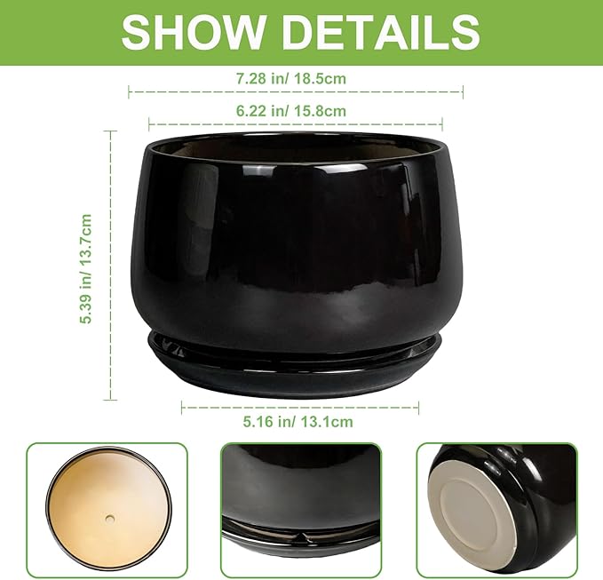 • Dimensions: These ceramic planters pit measures 7.28" x 7.28" x 5.39". Balck planter is an ideal choice for growing bonsai tree, snake plant, money tree, succulents, cacti, aloe vera, orchids, african violet, geranium plant, peace lily, monstera deliciosa and other indoor & outdoor plants
