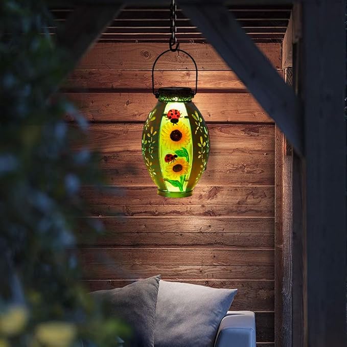 • 【Widely Used】Outdoor solar lanterns comes with a metal handle, so you can hang the glass lantern lamp on your patio, porch, garden, or shepherd hook, or place sunflower solar outdoor lanterns on indoor or outdoor table and floor. The lively sunflower decoration and warm light projection will make it an ideal choice for yard decoration.