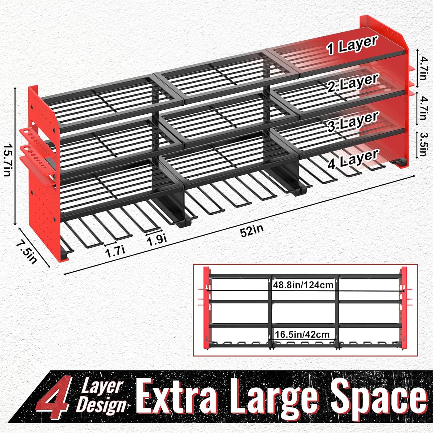 • 【12 Drill High-capacity Storage】This power tool organizer uses the latest four-tier high-capacity design. The bottom layer can store 8 cordless drills, the upper three layers can store other heavy tools or various small tools, and a hammer holder, pliers holder and screwdriver holder are added to the side.providing you a neat and efficient workbench!