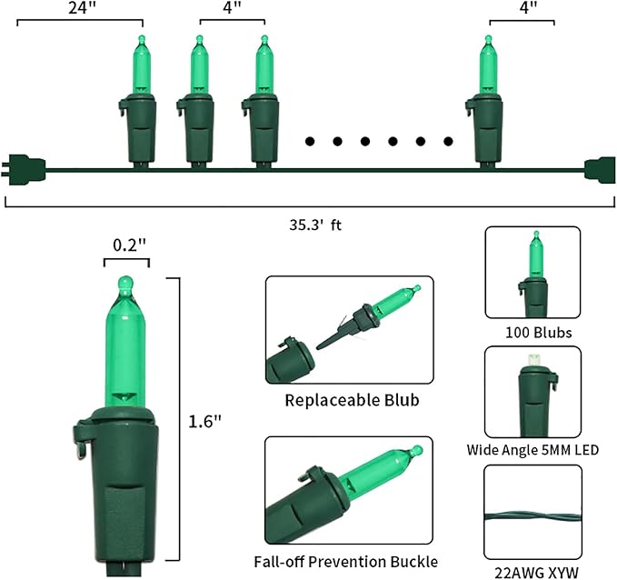 • 【Mini Christmas Lights Specification】: 1 Sets - white wire chritsmas light string includes 100 count green LED lights, total length 35.3ft, lights length 33ft and each led is 4 inches apart, 24 inches lead wire, 4 inches end connector (Extra 2 x bulbs and 1 x fuse included)