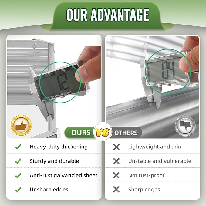 • BUILT TO LAST:THE garden bed is treated to withstand everyday wear and tear due to its 0.6mm thick, galvanized metal sheets and a highly durable zinc coating. Our prime materials ensure the garden bed is sturdy and maintains its shape over time. From heavy rain to extreme heat, we made sure to protect your garden bed from rust and corrosion, so it's the perfect choice if you're looking for a long-lasting solution.