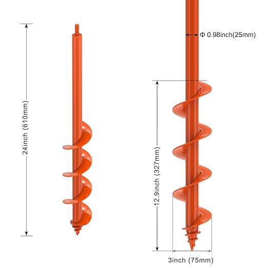 • π‘«π’Šπ’Žπ’†π’π’”π’Šπ’π’: The total length of garden auger =24'', solid steel diameter=0.98'', blade width=3'', blade thick=3mm, spiral length=12.9'', fits 3/8” drill chuck.