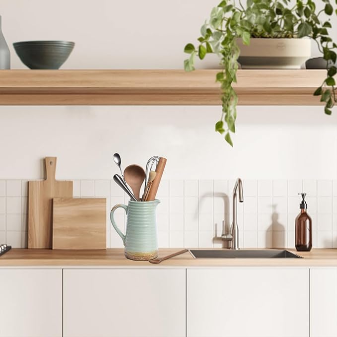 Quoowiit Ceramic Rustic Vase with Handle, Green Distressed Decorative Farmhouse Pitcher Vase for Home Decor Living Room Bedroom Kitchen Office Shelf Decor Centerpiece Table Decoration