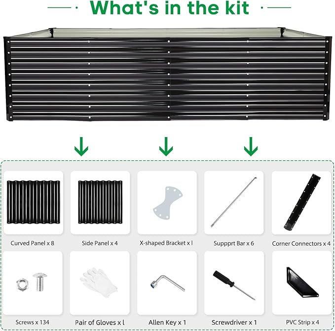 • What You Get: we have included Galvanized raised garden bed kit with detailed assembly instructions, corner protector, support rods ,safety gloves , wrench tools and with galvanized nuts and bolts in the box .These essential tools elevate your overall planting and gardening adventure