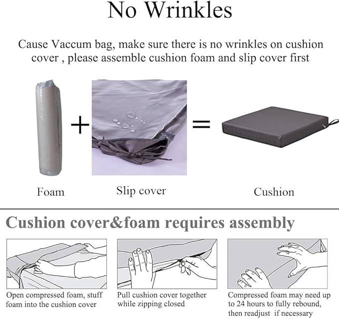 • 【Comfort & Support】 Experience ultimate comfort with the high density foam of these patio chair cushions set of 2. They provide excellent support for your hip, promoting good posture and allowing you to relax for extended periods of time. All outdoor dining chair cushions are packed with vacuum bag. You need to assemble cushion to make there is no wrinkles in cushion covers