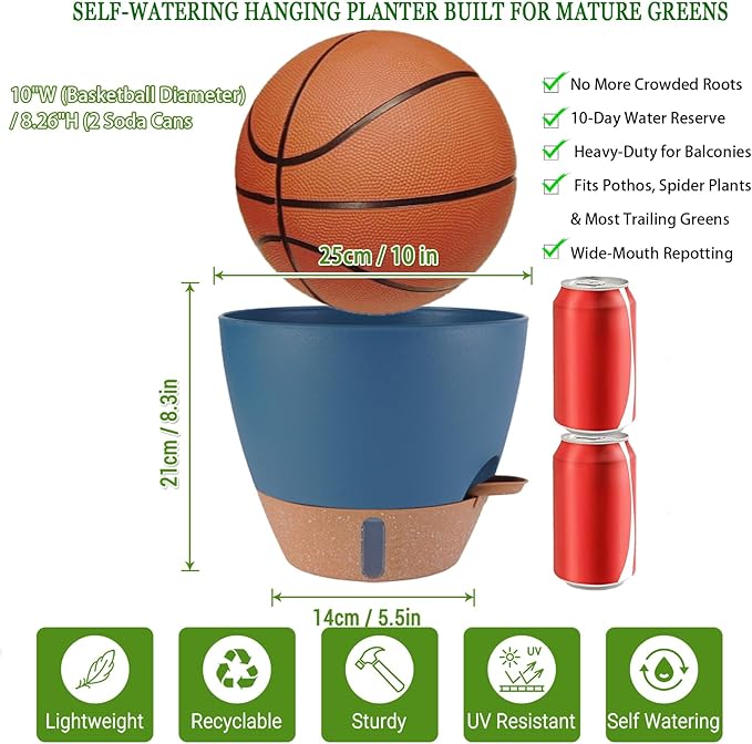 • Note: This large hanging planter features a 10-inch wide opening (comparable to a basketball's diameter) and stands 8.26" tall (about the height of two standard soda cans). Designed specifically for mature plants like spider plants and pothos, it is not recommended for small succulents or tight spaces. Always measure your current pots or intended placement area before purchase to ensure the dimensions meet your needs.