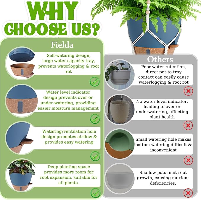 • 【Never Over/Underwater Again!】Fielda's indoor hanging planters feature an EXCLUSIVE WATER WINDOW in the base tray - instantly check moisture levels without guesswork! Protect your plants from dehydration and promote healthy root systems with this visual watering guide. Perfect for hanging pots for indoor plants enthusiasts who value scientific plant care.