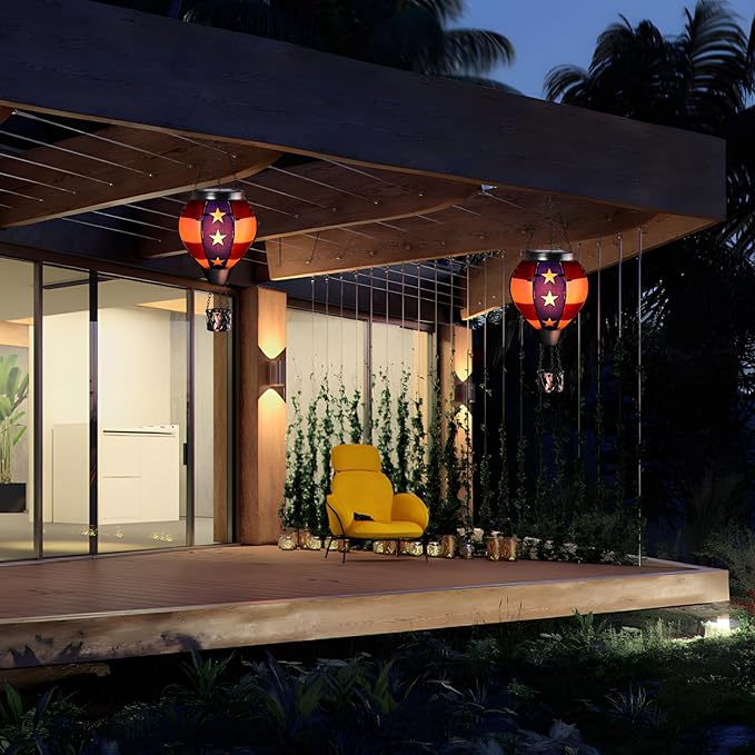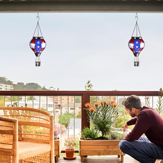 • 【Unique Hot Air Balloon Design】--This hanging solar light is composed of 8 pieces of flag style glass with lifelike flame lights. As night falls, their glow adds warmth and comfort to your garden, patio, yard, path, and more. July 4th Independence Day decoration, great Christmas decorative lights.