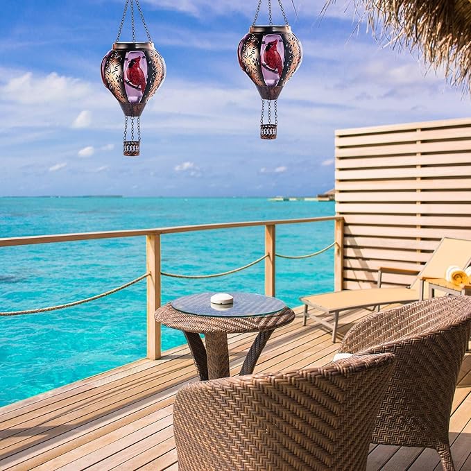 • 【Unique Hot Air Balloon Design】--This hanging solar light is composed of 4 pieces of cardinal glass and 4 pieces of hollow out metal with lifelike flame lights. As night falls, their glow adds warmth and comfort to your garden, patio, yard, path, and more, great Christmas and holiday decorative lights.