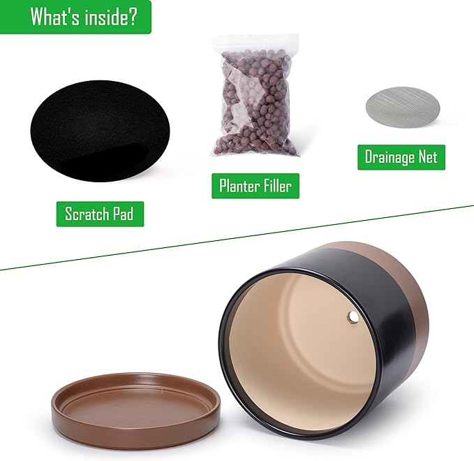 • Planter pot with drainage hole, mesh drainage net and protective scratch pad included.