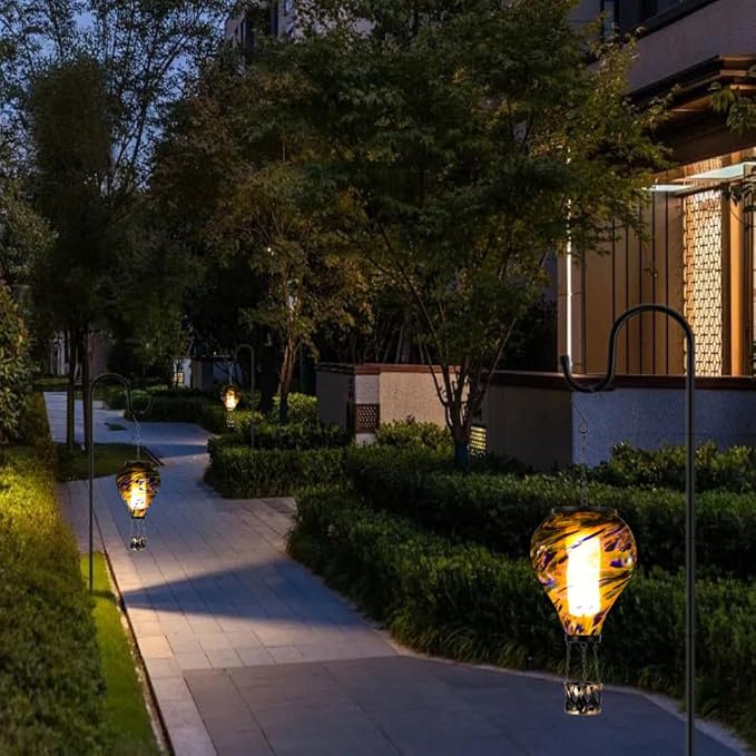 • 【Wide Application】Solar hot air balloon lantern with flame is a great home decor. You can hang the solar lantern on porches, trees, pergolas, balconies, or ledge. Add elegance and color to your outdoor space with this beautifully crafted hot air balloon decorations.