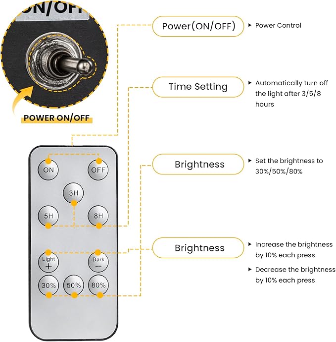• Smart Remote Control | 3 Timer Modes + 10% Increment Brightness Customize ambiance or security with 3 preset timers (3H/5H/8H) and 3 adjustable brightness levels (30%-80%). Fine-tune brightness by 10% increments via remote—unmatched flexibility vs. rigid 30% steps in other brands. Pre-installed bulb and steel-reinforced base ensure 1-minute setup.
