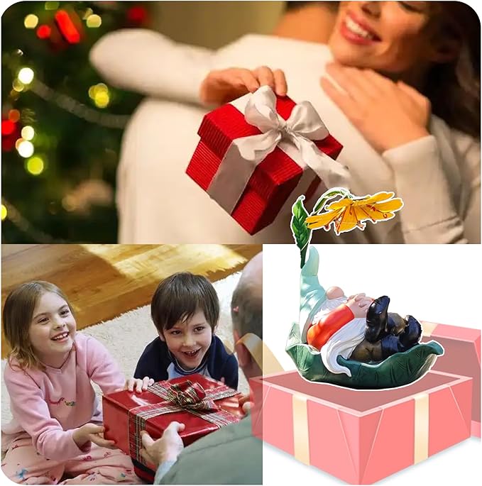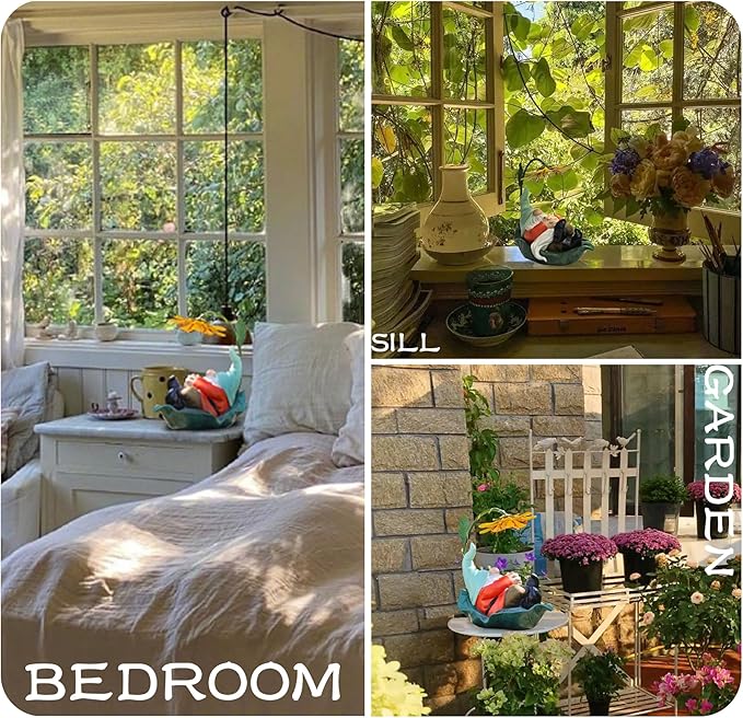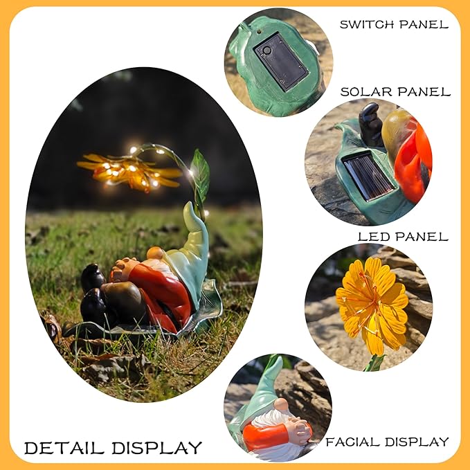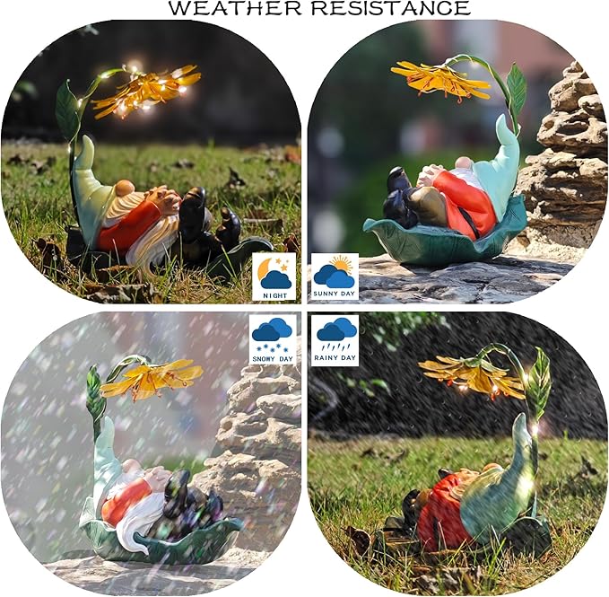 • 【Charming Design】: This whimsical resin gnome lies on a large green leaf, wearing a light-green hat and using a big yellow stamen as a sunshade. Its decorative, funny face and artistic details add a heartwarming touch to any garden or flower bed.