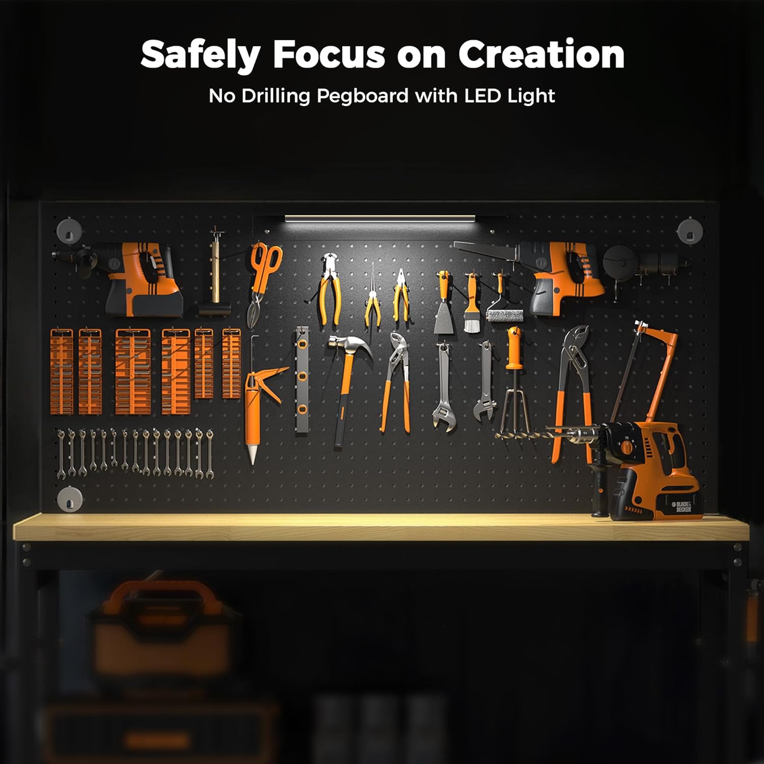 • [Safely focus on creation] ETL Certification Built-in Power Strip with buttons and convenient access to power tools. There are 4 AC outlets, 2 USB-A ports on the power strip with 6.5 FT cables. And the socket is ETL-certified for safety and durability. The LED Lighting fixed on the pegboard provides ample illumination for you in the dark, allowing you to enjoy focused moments anytime.