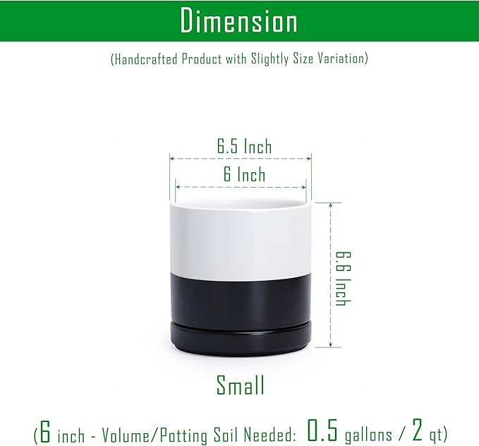 • Multiple Size Options: Available in six sizes (3.5" to 11.8") to fit plants of all types, from small succulents to larger houseplants. Small 6 Inch Planter Pot: 6.5" Diameter x 6.6" H, Potting Soil Needed: 0.5 gallons / 2 qt.