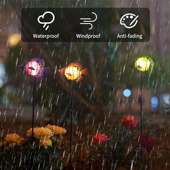 • Unique Solar Lights:A set of garden solar lights includes three small fish in different colors. You can place them anywhere to add a relaxing ocean ambiance to your life effortlessly. The decorative solar garden stakes will bring you unexpected visual effects