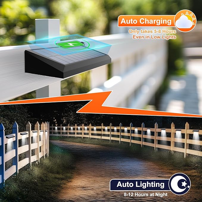 • Smart Auto On/Off Sensor: The solar fence lights auto charged 4-6 hours at daytime and auto work 8-12 hours. And auto illuminates at dusk and turns off at dawn, saving energy and ensuring hassle-free operation for homeowners. Enjoy the convenience of intelligent lighting!