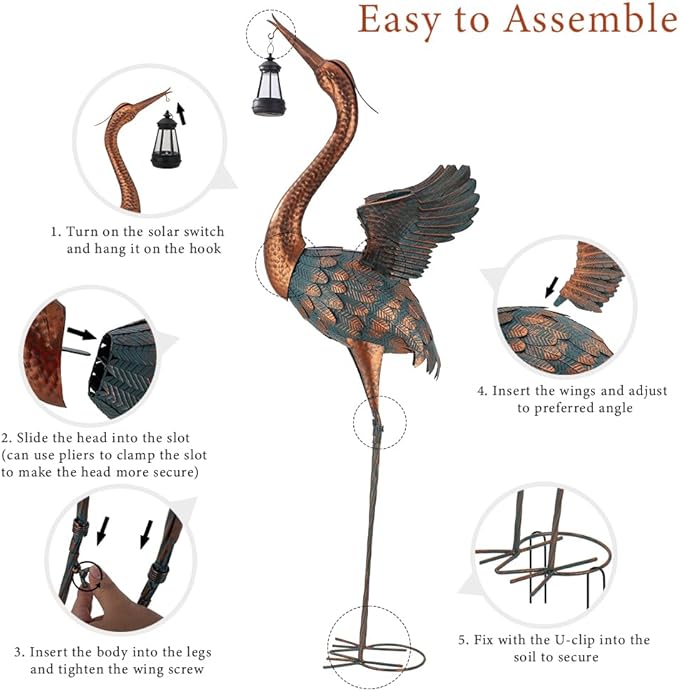 • Easy to Assemble: No tools necessary, just insert the head and legs of the crane yard statues on the body, comes with the deep and sturdy U-shaped ground stakes to secure in the ground enhance stability