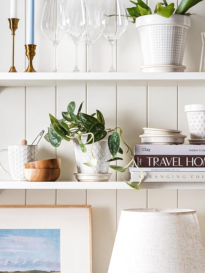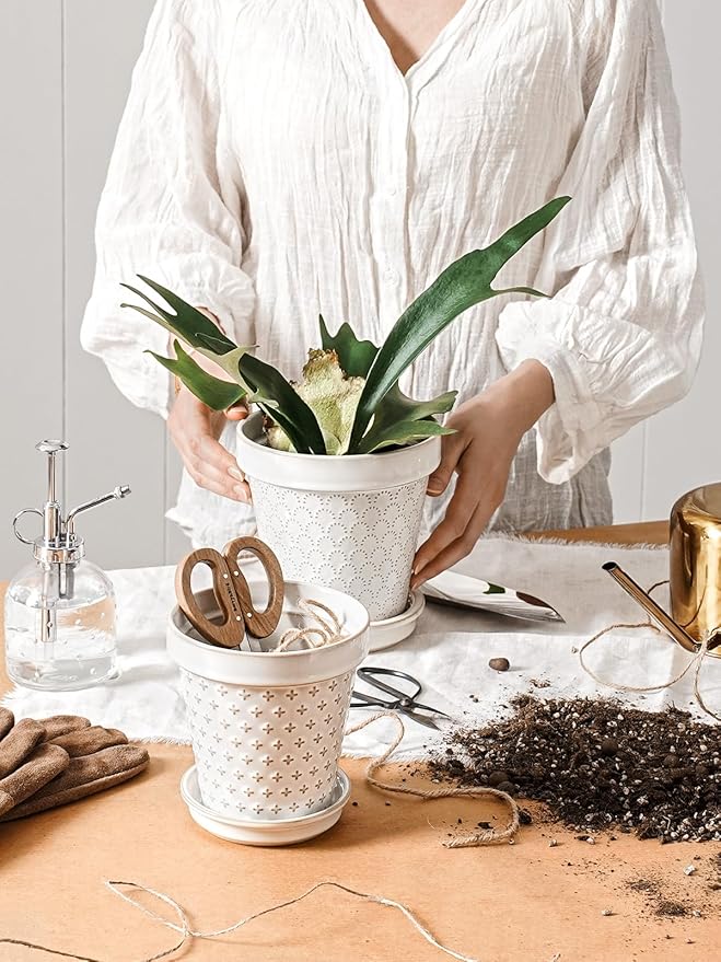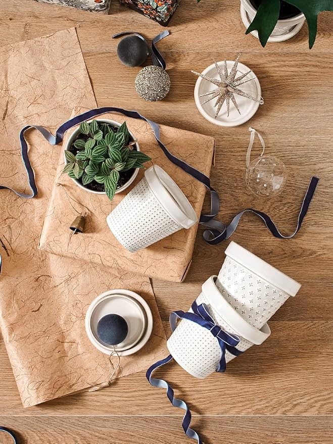 • Decor Living Space: Discover a cute embossed design ceramic pots –4.9 inches in diameter and 3.9 inches top opening, good for small and medium sized plants and flowers such as succulents, African violet, vanilla, basil, etc. These ceramic flower pots add a touch of green to tables, windowsills, balconies, or bookshelves. The delicate balance of embossed design and botanical vitality converges, creating an atmosphere of unparalleled grace and visual delight