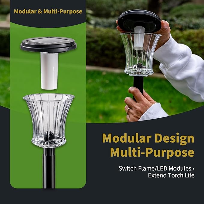 • High-Efficiency Solar Power & Easy Install - Our solar torch lights collect energy all day through efficient panels for evening illumination. When fully charged, enjoy over 10 hours of realistic dancing flames that create a warm, comfortable atmosphere perfect for garden decor, pathway lighting and patio gatherings. Sensors automatically activate at dusk and deactivate at dawn. Installation is simple - no tools or wiring needed, just insert into ground for instant torch-like ambiance.