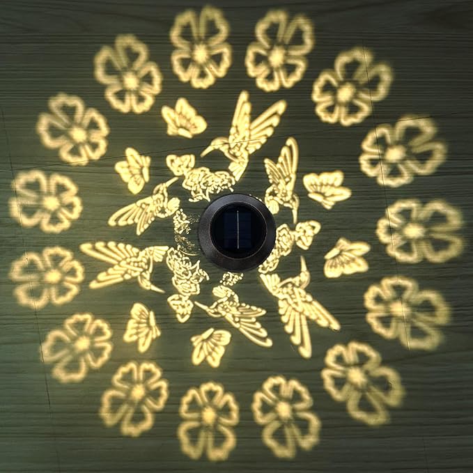 • Refined Hummingbird Design: This solar garden light features an charming hummingbird and floral cutout with a vintage copper metal finish. When illuminated, it casts stunning light patterns, creating a warm and inviting ambiance for your outdoor spaces. A beautiful addition to your solar walkway lights outdoor setup, perfect for enhancing yards, pathways, patios, and gardens