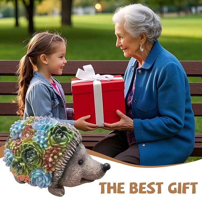 J.CARP Outdoor Solar Garden Hedgehog Statue with Succulents and 7 LED Lights, Decorations for Garden, Patio, Lawn, Outdoor Yard and Deck, Unique Housewarming Gifts