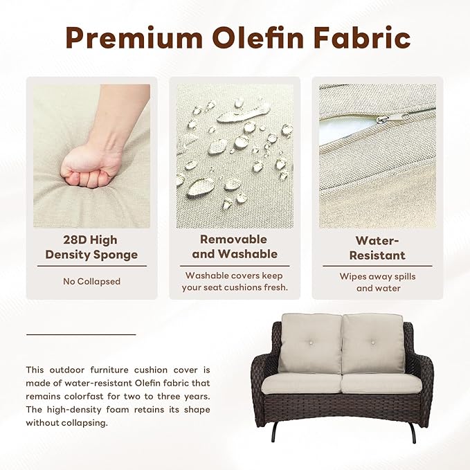 • 4. Comfortable Deep Seating with Plush Cushions: The loveseat glider chair and swivel glider chairs come with 4-inch thick, sponge-padded cushions that provide excellent support and comfort. The high backrest and wide armrests enhance relaxation, while the olefin fabric is water-repellent, easy to clean, and fade-resistant for long-term use.