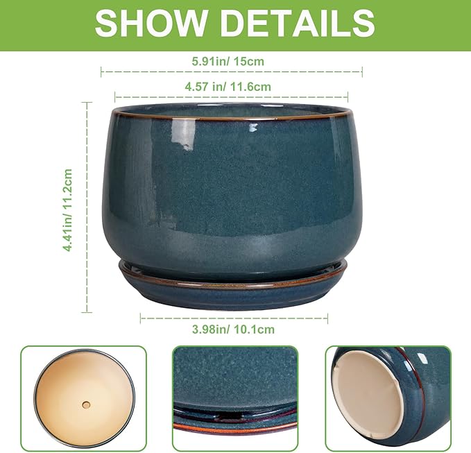 • Dimensions: This ceramic plant pot pit measures 5.91" x 5.91" x 4.41". This blue flower pot is an ideal choice for growing succulent plants, cacti, aloe vera, orchids, snake plant, african violet and other indoor & outdoor plants