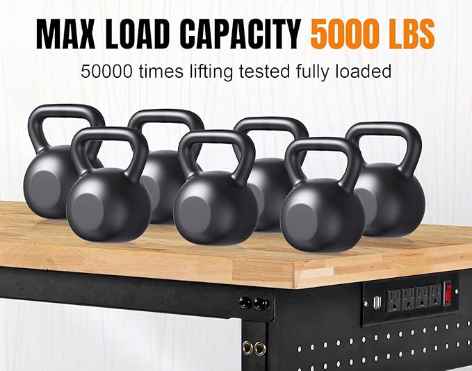 • POWER OUTLET & PEGBOARD: The ETL-certified power outlet features 4 AC outlets, 2 USBs, and 1 switch with a 9.8-foot extension cord for safety and durability. An additional pegboard allows you to efficiently organize accessories and tools to keep your workspace tidy and maximize the usefulness of your workbench.