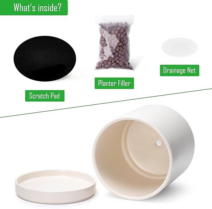 • Planter pot with drainage hole, mesh drainage net and protective scratch pad included.