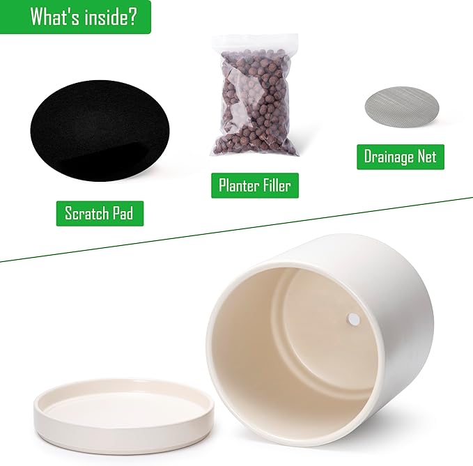 • Planter pot with drainage hole, mesh drainage net and protective scratch pad included.
