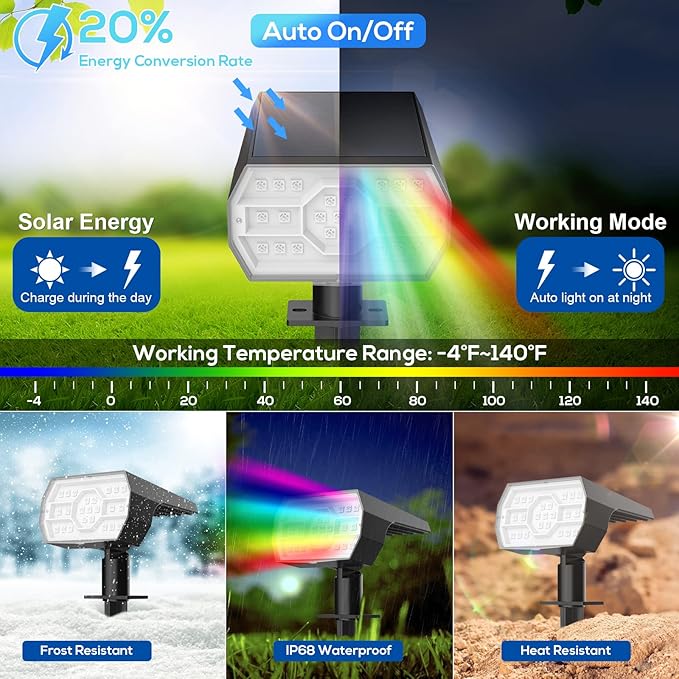 • Solar Yard Lights: Outdoor Lights are Waterproof, Frostproof, and Weatherproof - Using ABS high-strength material, these lights can work under -4℉~140℉. The IP68 waterproof rating allows the solar garden lights to withstand all kinds of bad weather such as rain, snow, wind frost, high temperature, etc. It is perfect for outdoor use! Anti-fogging design - can perfectly solve the problem of fogging on the lens, maintaining light intensity and prolonging the service life.