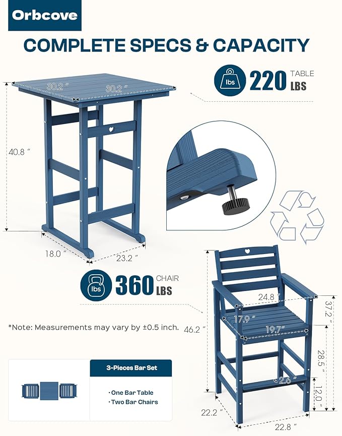 • Durable All-Weather Design: (Please note!!!Your order consists of two separate packages, which may be delivered at different times.) Crafted from HDPE with a natural wood grain finish, Orbcove patio table and chairs set withstands sun, rain, and wind without fading or cracking. Ideal for deck furniture, backyard furniture, or porch furniture, it’s perfect for year-round outdoor living.