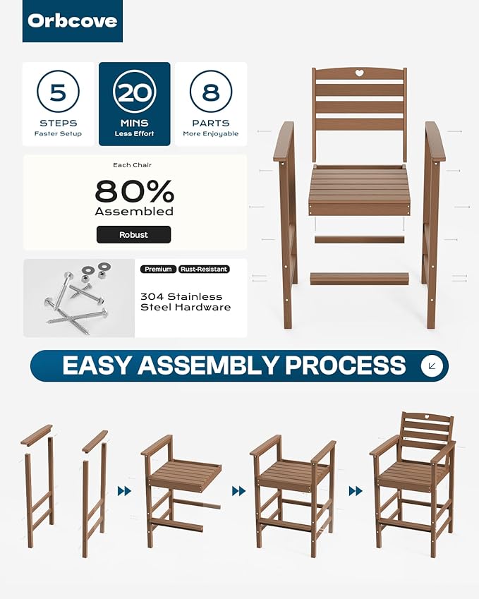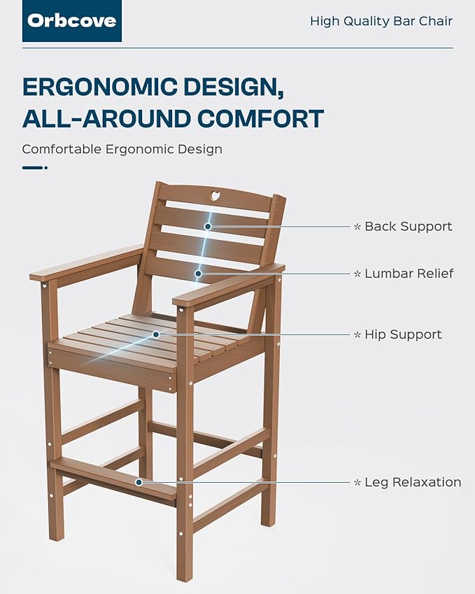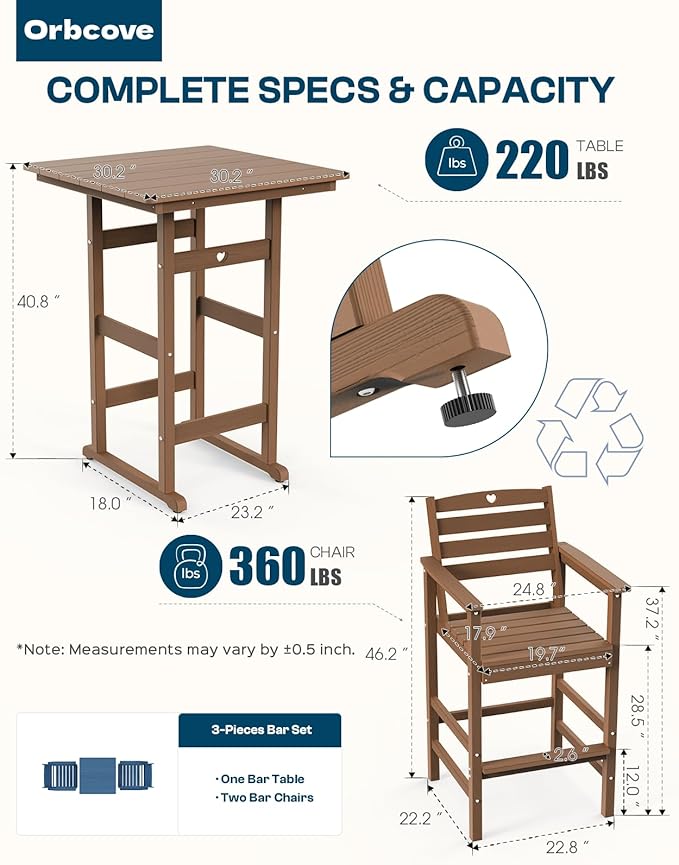 • Durable All-Weather Design: (Your order will arrive in two separate shipments, which may not be delivered simultaneously.) Crafted from HDPE with a natural wood grain finish, Orbcove bar table and chairs set withstands sun, rain, and wind without fading or cracking. Ideal for deck furniture, backyard furniture, or porch furniture, it’s perfect for year-round outdoor living.