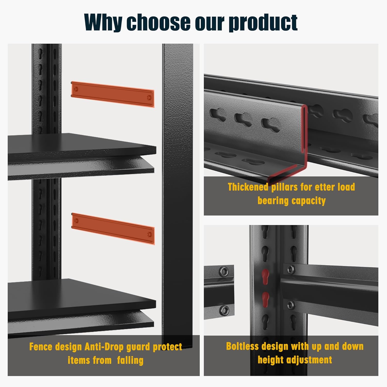 • 【Garage Shelving Heavy Duty】:Our metal storage shelves are made of heavy-duty steel and have been upgraded to double layered columns, each with supporting ribs, and the surface of the shelves is coated with high-quality powder coating. It is not only sturdy and durable, but also ensures that the shelf maintains its appearance and performance in various environments. Each shelf can carry up to 900 pounds, and the maximum weight capacity of 4500 lbs.