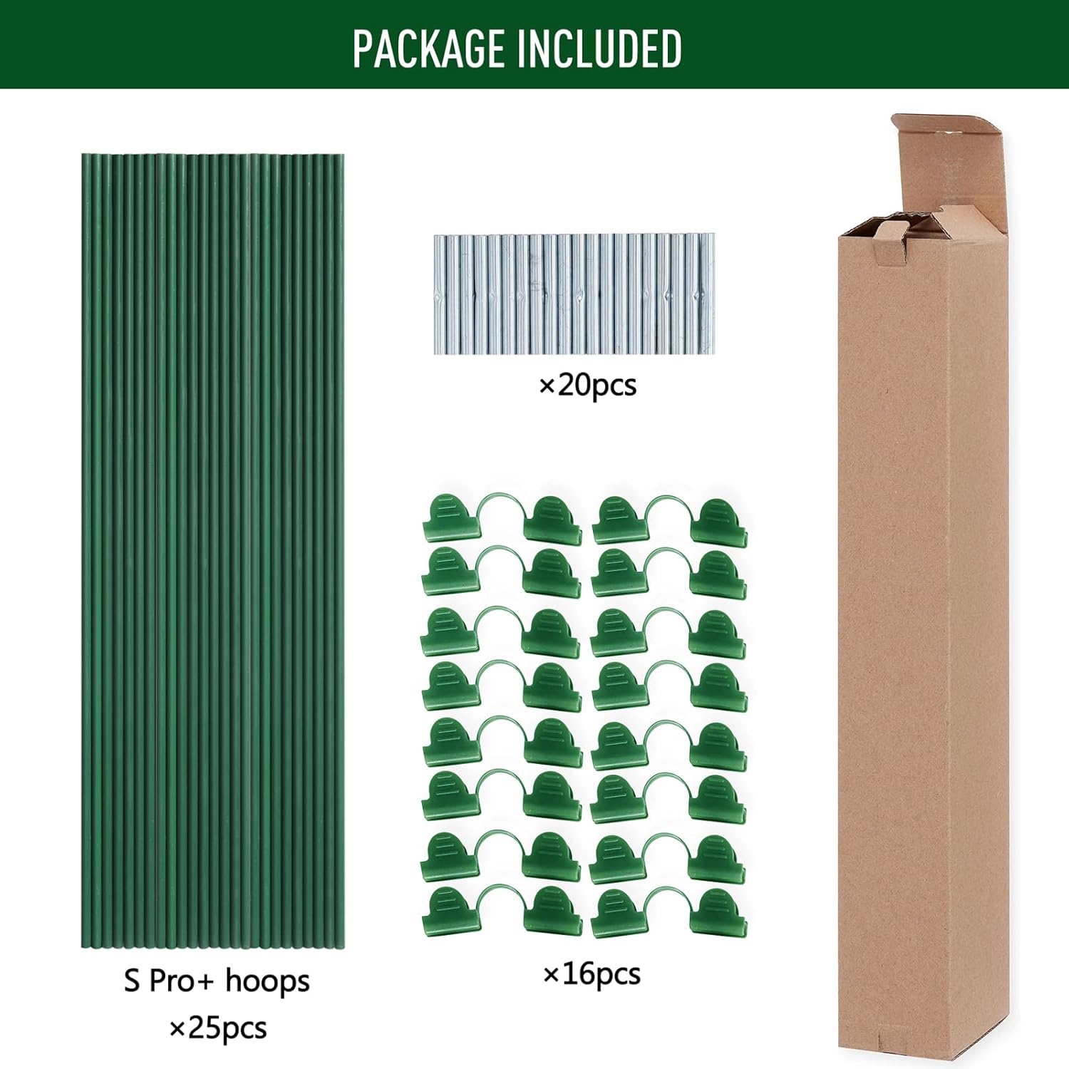 • 【DIY KIT】Includes 25 small-diameter hoops, each 17" long, 20 connectors, and 16 clips. You can combine 4 or more hoops to create your own grow tunnel. The clips can also be used to secure the greenhouse covering.
