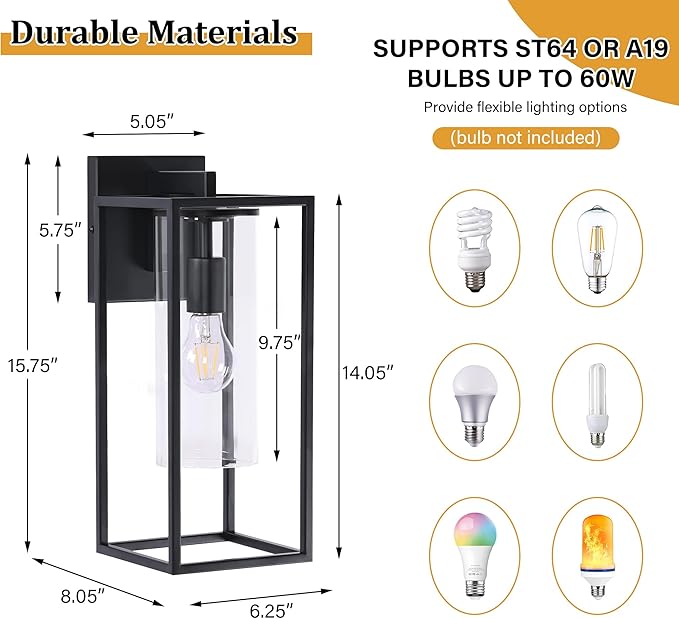 • 【E26 Socket & Recommended Bulbs】Bulbs Not Included. The waterproof porch lights for house can compatible with types of E26 bulbs. (LED bulb, Incandescent or CFL bulb) And this exterior lights for house with basic lighting features last longer than those lights with easily damaged. Save you the hassle of frequent light replacement