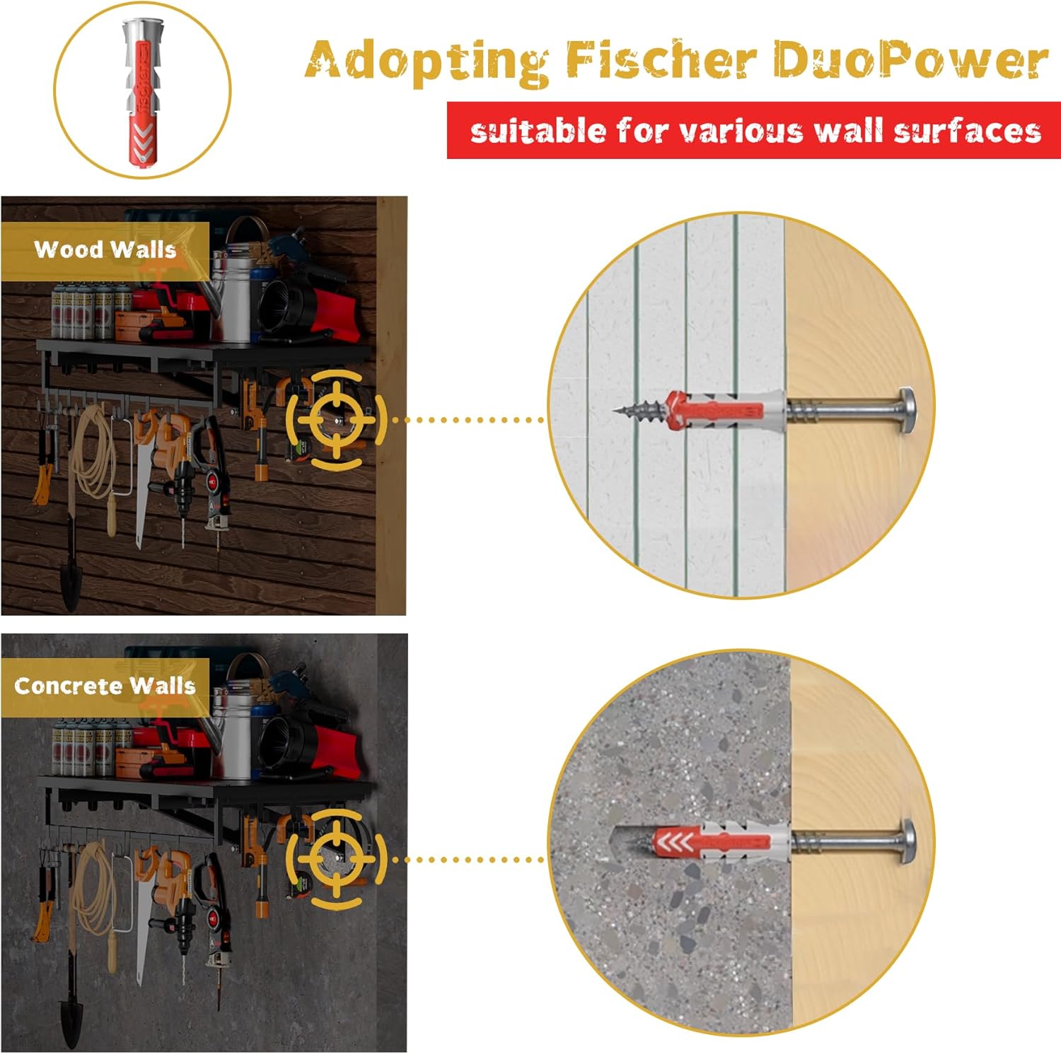 • Space-Saving & Efficient Organization:This wall-mounted power tool organizer maximizes unused wall space, transforming it into a compact and clutter-free storage area. Keep your power and handheld tools neatly displayed, easily accessible, and within arm’s reach—combining practicality with a clean, decorative look for your workspace