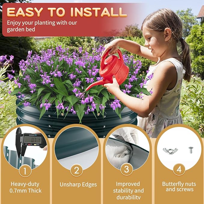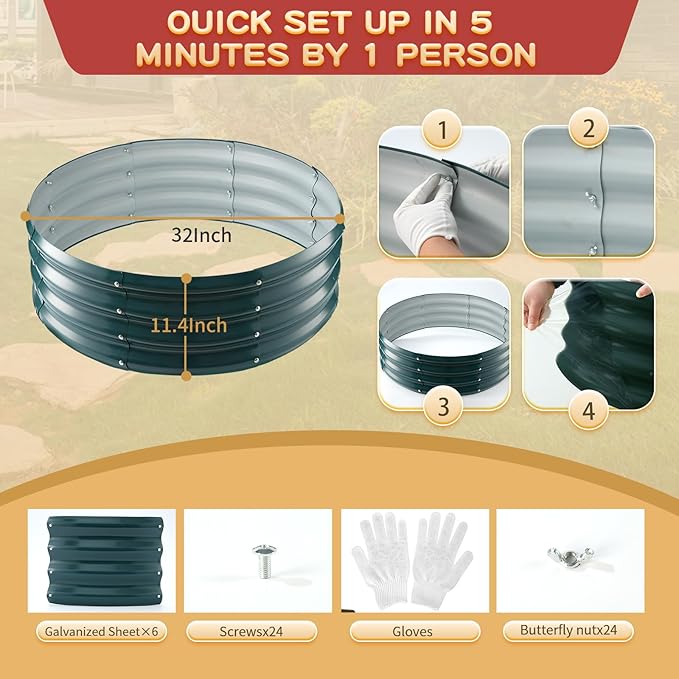 • 【DURABLE & STABLE】: ZBZBML round raised garden bed (2.7×2.7×1ft) is 32 IN Diameter,11.8IN Tall, each is made of 0.8MM thick Q195 galvanized metal sheet painted, double-layer anti-corrosion galvanizing and round structure design,it is built to providing a solid foundation for your plants.