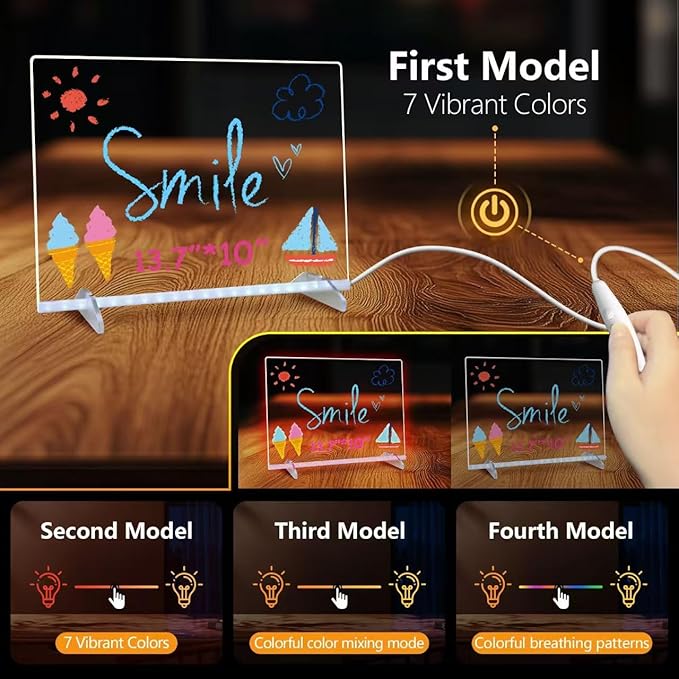• 2025 Upgraded LED Drawing Board: This LED drawing board with colors is crafted from premium water-soluble material. Its surface is designed to be scratch-resistant, so it won't get scratched even when wiped. The perfect 13.7“x10” size provides plenty of space for creativity. Additionally, it has 20 built-in holes with adjustable buttons that allow you to control the brightness of the light or flashing speed, making it an ideal choice for those seeking an experience with the LED drawing board for kids.​
