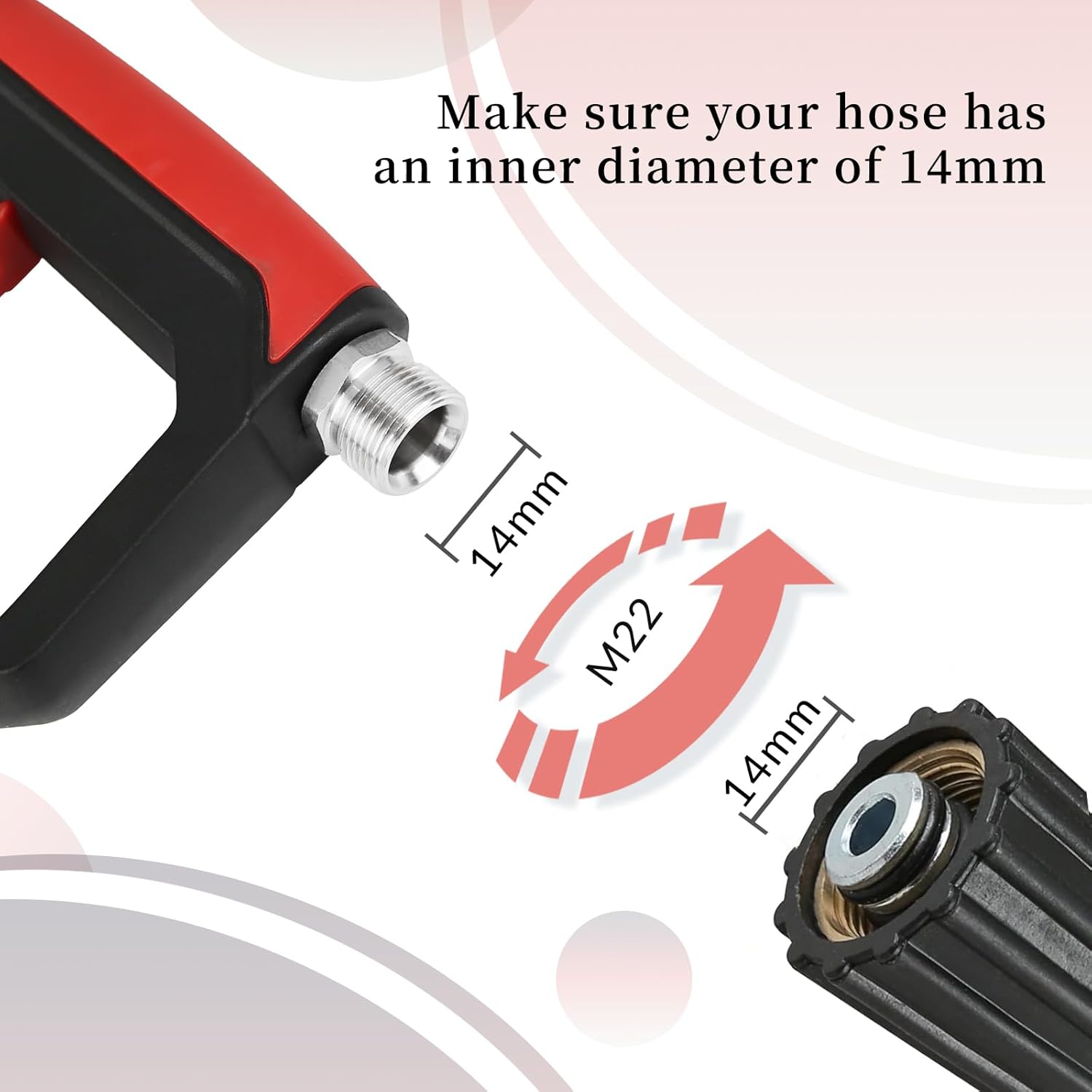• 【Pressure Washer Gun】Sooprinse pressure washer gun specially designed for car wash enthusiasts, suitable for 4000 PSI high pressure washer. And the gun equipped with 1/4 quick connector, M22-14 connector. Suitable for most of the pressure washer.