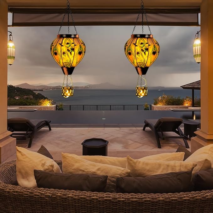 • Solar Lanterns Perfect Size: The product package contains 1 Peacock hot air balloon solar lanterns;Hanging solar lantern 5.5 "wide *18" high,easy hanging and durable,Perfect for various outdoor spaces like gardens,front doors, patios,pathways,yards,courtyards,pavilions,windowsills,or party decor